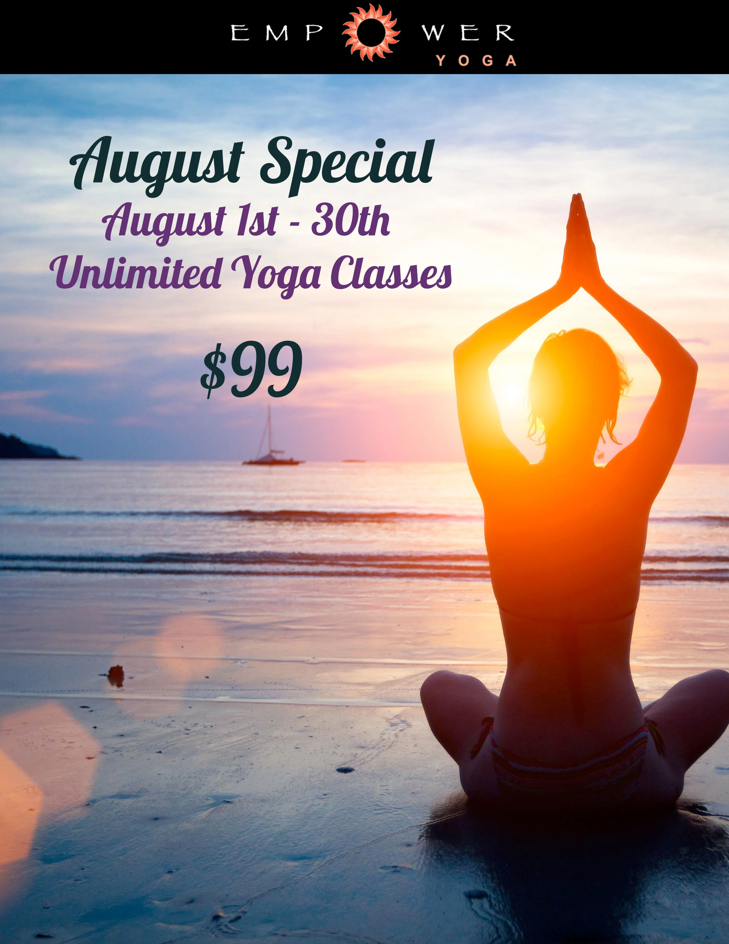 Lisa Garlitz August 2, 2017 August Special - $99 Unlimited Classes for 30 days! August 1st - 30th Lisa Garlitz August 2, 2017 $99 Unlimited Classes August 1st - August 30th Buy Now